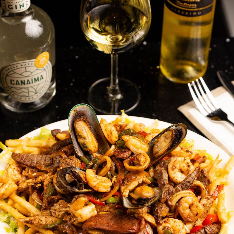 Mix grilled meats (chicken. beef. chorizo and vegetables) with french fries