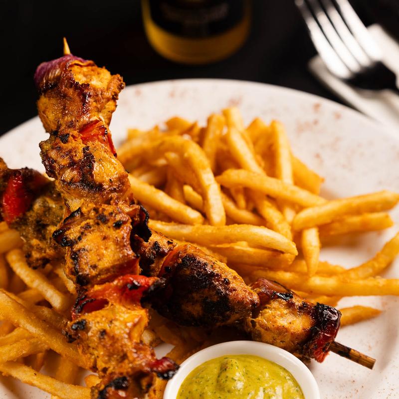 Chicken skewers with garlic sauce and French fries
